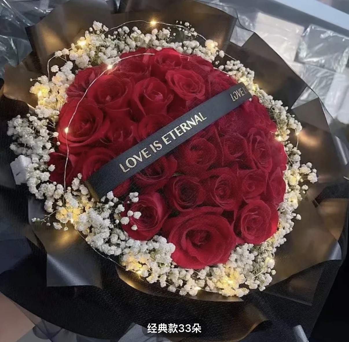 【缘定三生】33朵红玫瑰满天星花束生日鲜花女士生日花束生日礼物送女朋友花店配送花上门