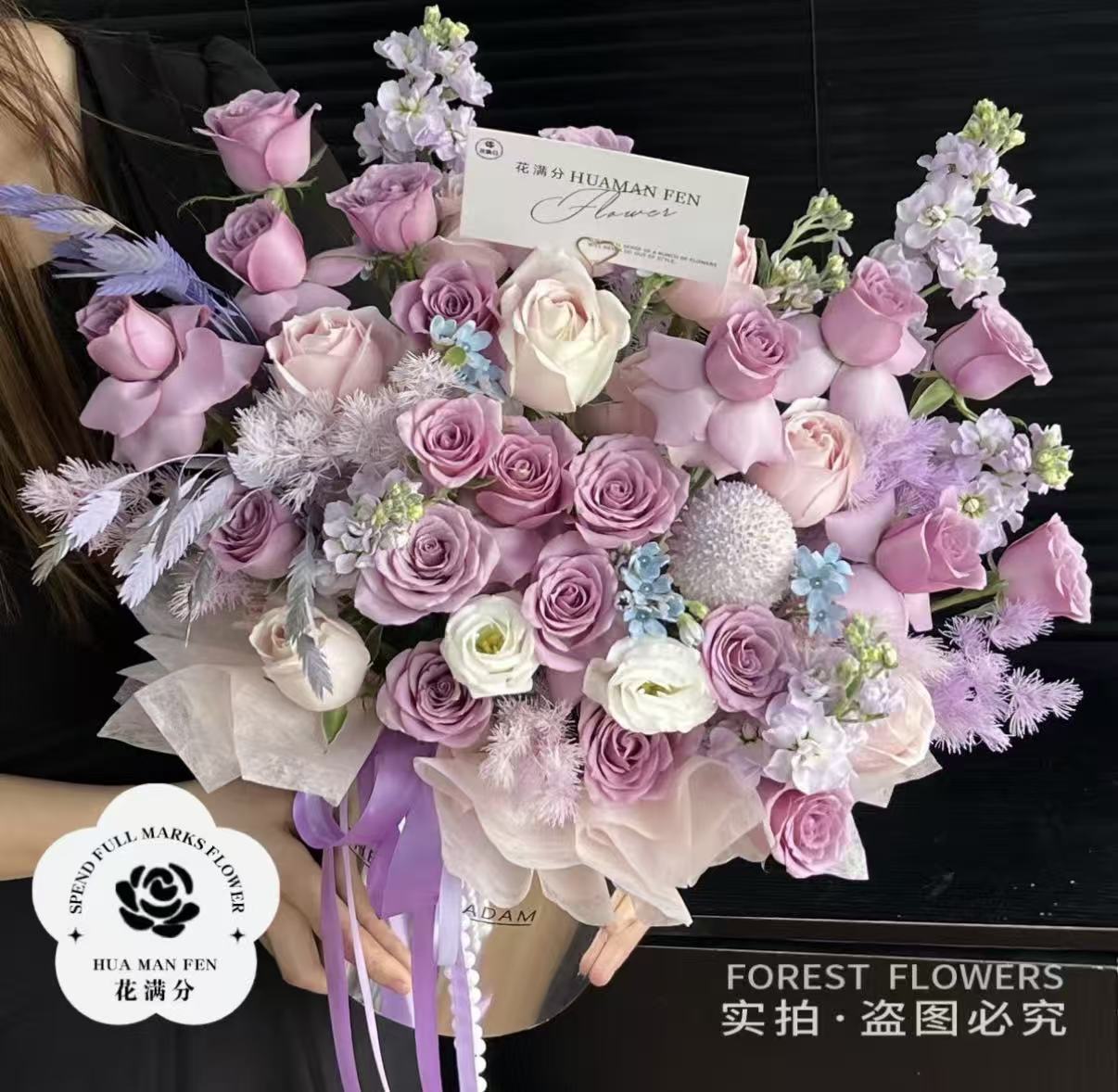 【灯下雪昼】粉玫瑰混搭紫玫瑰桔梗抱抱桶花束生日鲜花送女友闺蜜朋友花店送花上门